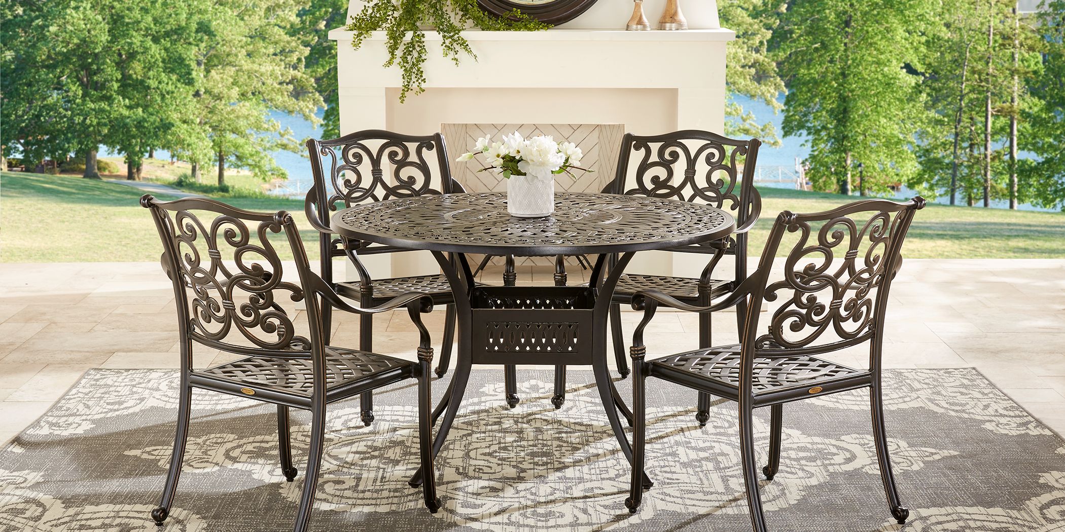 Find the perfect patio furniture & backyard decor at hayneedle, where you can buy online while you explore our room designs and curated looks for tips, ideas & inspiration to help you along the way. 5% coupon applied at checkout. Frp 5 pieces outdoor dining set patio furniture with metal slat finish, steel tube 38 round patio table, patio table and chairs with 1'5 umbrella hole 4.1 out of 5 stars 233 $399.99 $ 399. Shop this collection (76) phoenix hammered bronze round aluminum outdoor dining table. Choose from contactless same day delivery, drive up and more.